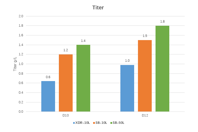 汉腾生物拥有国内独有的环轨摇晃式生物反应器平台,该平台具有低剪切力,高氧传质效率,并具有良好的摇瓶至2500L规模放大一致性等优点。同时由于特殊的培养方式,该平台适合对剪切力敏感的蛋白生产(包括重组蛋白,双抗等)。本案例中切换至10L环轨摇晃式反应器(OrbShake SB10-X),相对传统10L搅拌式反应器(XDR-10L),表达量提升50%;另外,在OrbShake SB10-X放大至OrbShake SB50-X中,单位体积内表达量也提高了20%。