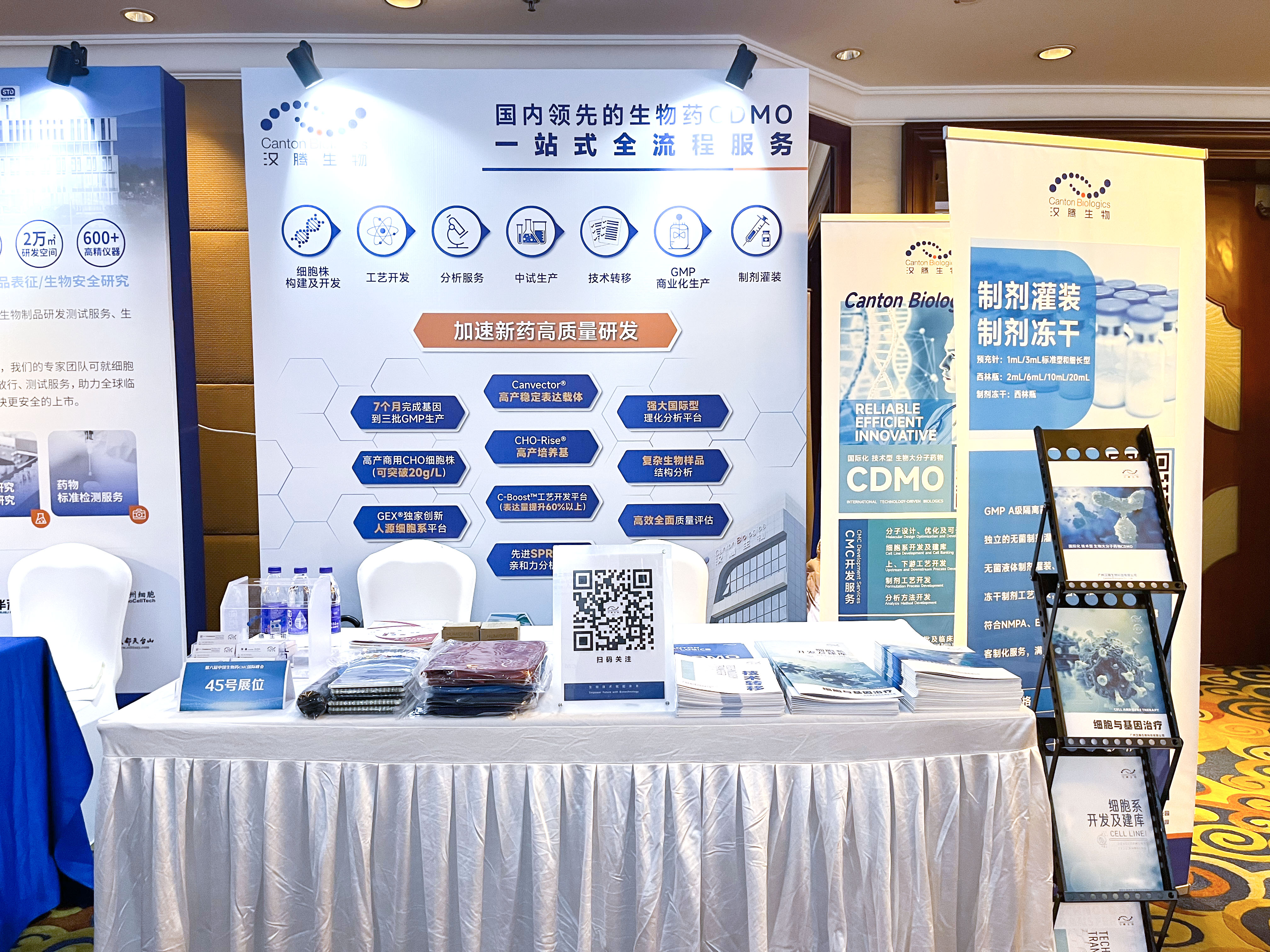 汉腾生物携国内领先的生物药CDMO一站式解决方案精彩亮相,并由汉腾生物创始人兼CEO沈潇博士,汉腾生物副总裁Daniel Gao等多位高管,以及工作人员到场交流互动。汉腾生物的CDMO一站式解决方案包括了细胞株构建及开发、工艺开发、分析服务、中试生产、技术转移、GMP商业化生产和制剂罐装等技术服务,因其“7个月完成基因到三批GMP生产(高效)、高产商用CHO细胞株(可突破20g/L)、GEX®独家创新人源细胞系平台和复杂生物样品结构分析”等特色优势,吸引了不少观众驻足咨询。